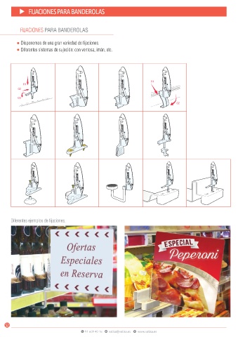 FIJACIONES PARA BANDEROLAS FIJACIONES PARA BANDEROLAS Disponemos de una gran variedad de fijaciones. Diferentes sistemas de sujeción: con ventosa, imán, etc. Diferentes ejemplos de fijaciones. 09 52 91 609 40 16 vatisa@vatisa.es www.vatisa.es
