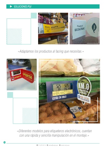 SOLUCIONES PLV «Adaptamos los productos al facing que necesitas.» «Diferentes modelos para etiqueteros electrónicos, cuentan con una rápida y sencilla manipulación en el montaje.» 170 91 609 40 16 vatisa@vatisa.es www.vatisa.es